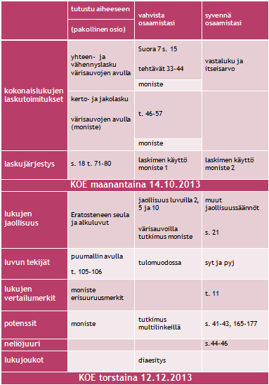 Syksyn alussa 7.-luokkalaisille on annettu oheinen taulukko, jonka mukaan he etenevät (Kuvio 1): Kaikkien on tehtävä pakollinen osio, vahvista osaamistasi ja syvennä osaamistasi on korkeampiin arvosanoihin tähtääville. Taulukossa voi edetä joko sarake kerrallaan – kun pakollinen osio on tehty, voi siirtyä vahvista osaamistasi –osioon. Varsinkin korkeampiin arvosanoihin tähtäävät voivat myös edetä rivi kerrallaan perustehtävistä haastavampiin.